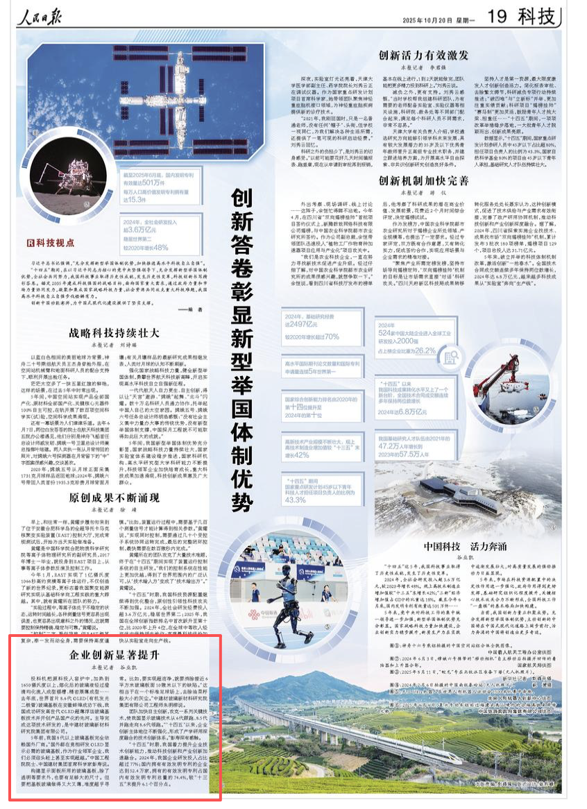 来源:人民日报 发布时间:2025-10-2310月20日,《人民日报》整版聚焦“十四五”期间的创新科技成果,彰显我国新型举国体制优势。其中,《企业创新显著提升》一文报道bet3365官方亚洲版集团旗下中建材玻璃新材料研究院成功研发全球首片8.6代OLED超薄浮法玻璃基板,打破高世代玻璃基板长期被国外垄断的局面,实现我国显示玻璃技术从跟跑到领跑的跨越,展现企业创新主体地位和产学研融合体系的显著提升。一起来看看全文报道吧!